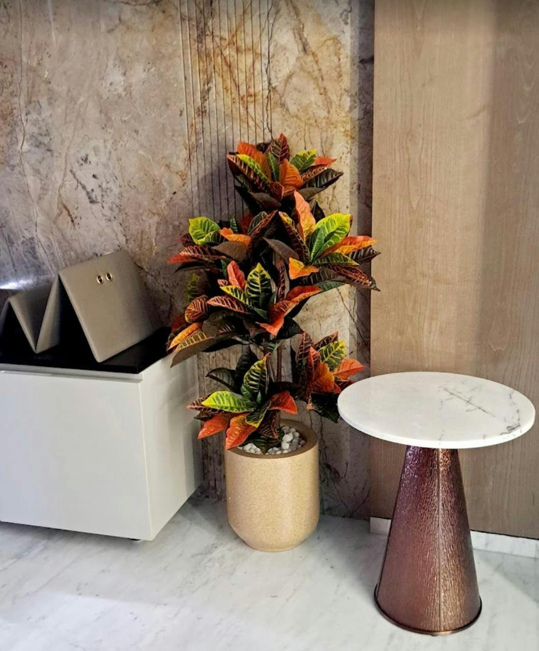 This 4 Feet artificial Croton Plant with Pot bursts with colorful faux stems and sticks in a vibrant pot, ideal for home decor and interior decor.
